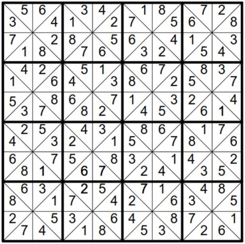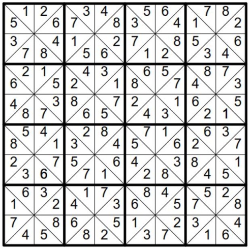 New to Conceptis?Play our free Sudoku puzzles online or try them out on your iPhone or iPad! I have always had a strong desire to create a different kind of Sudoku puzzle that will serve as the Sudoku of the future, to show that several other forms of Sudoku puzzles exist and are yet to be discovered. The inspiration came when I got bored solving typical 9x9 classic Sudoku. At that point I could complete a very hard Sudoku puzzle in record time so I wanted something more challenging and yet still very exciting. I started by creating different types of grids and trying to fit numbers into them. Wherever I saw patterns on the wall or on tiles, I tried to make a Sudoku out of it, but it never worked. I failed severely but kept on trying for days and months. Then I discovered this particular grid. The patterns were so impressive and something kept telling me that I could make a Sudoku out of it. I started by filling a box, then a line on the top column and magically I saw the entire thing just fit in. I was in tears. I couldn’t contain the joy of seeing that a brand new Sudoku had just been born out my determination and strong desire to create one. Named after Will ShortzOver time I created several other exciting variants from my invention, discovered that this puzzle is very versatile, and decided to post samples of my work to Will Shortz, the founder and current president of the World Puzzle Federation. Will was very supportive of my work and invited me to attend the WPF championship which at that time was about to be held in Beijing, China. When I found that no puzzle has ever been named after Will Shortz despite his huge achievements in the area of puzzling, I decided to blaze the trail and name my puzzle in his honor. Below is a sample of a solved Will Sudoku. The grid is made up of 16 square boxes where each box contains 8 triangular cells. Hence, the entire grid contains a total of 128 cells. In addition, it has 16 vertical and 16 horizontal lines, each of which also contains 8 triangular cells.