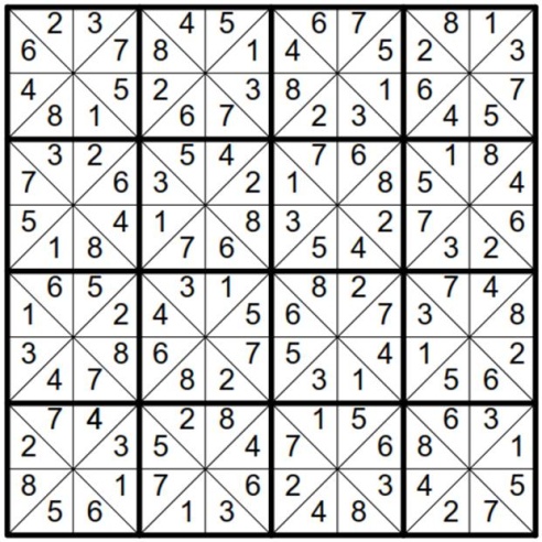Will Sudoku has five basic variant forms which are illustrated below. The variations mainly affect the shape of the boxes but the objective of the puzzle basically remains the same. Will Sudoku with Triangular Boxes